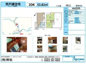 空き家バンク【売買】450万円 神奈川県足柄上郡山北町中川 温泉近い・吹抜け有 詳細はお問合せの駐車場付き2DK2階建 売買価格:450万円 | 賃貸価格: | 2DK | 建物-面積:53.82㎡ | 土地-面積:320㎡